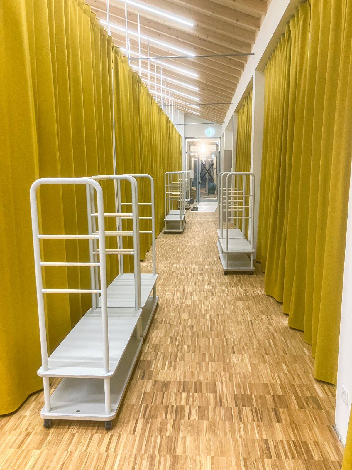 Una dintre inovații este sistemul de compartimentare a camerelor roocs de la Gerriets, care este combinat cu perdele de sunet OFFICE. Soluția de cameră eficientă din punct de vedere acustic este de sine stătătoare și oferă compartimentare modulară și flexibilă a încăperii.